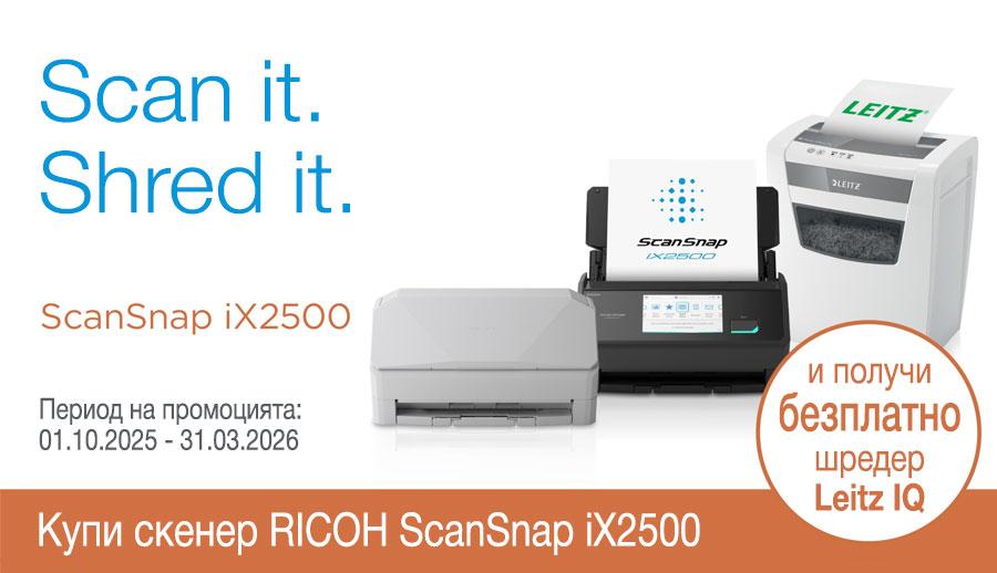 PFU Промоция: Купи скенер RICOH iX2500 и получи безплатно шредер Leitz IQ