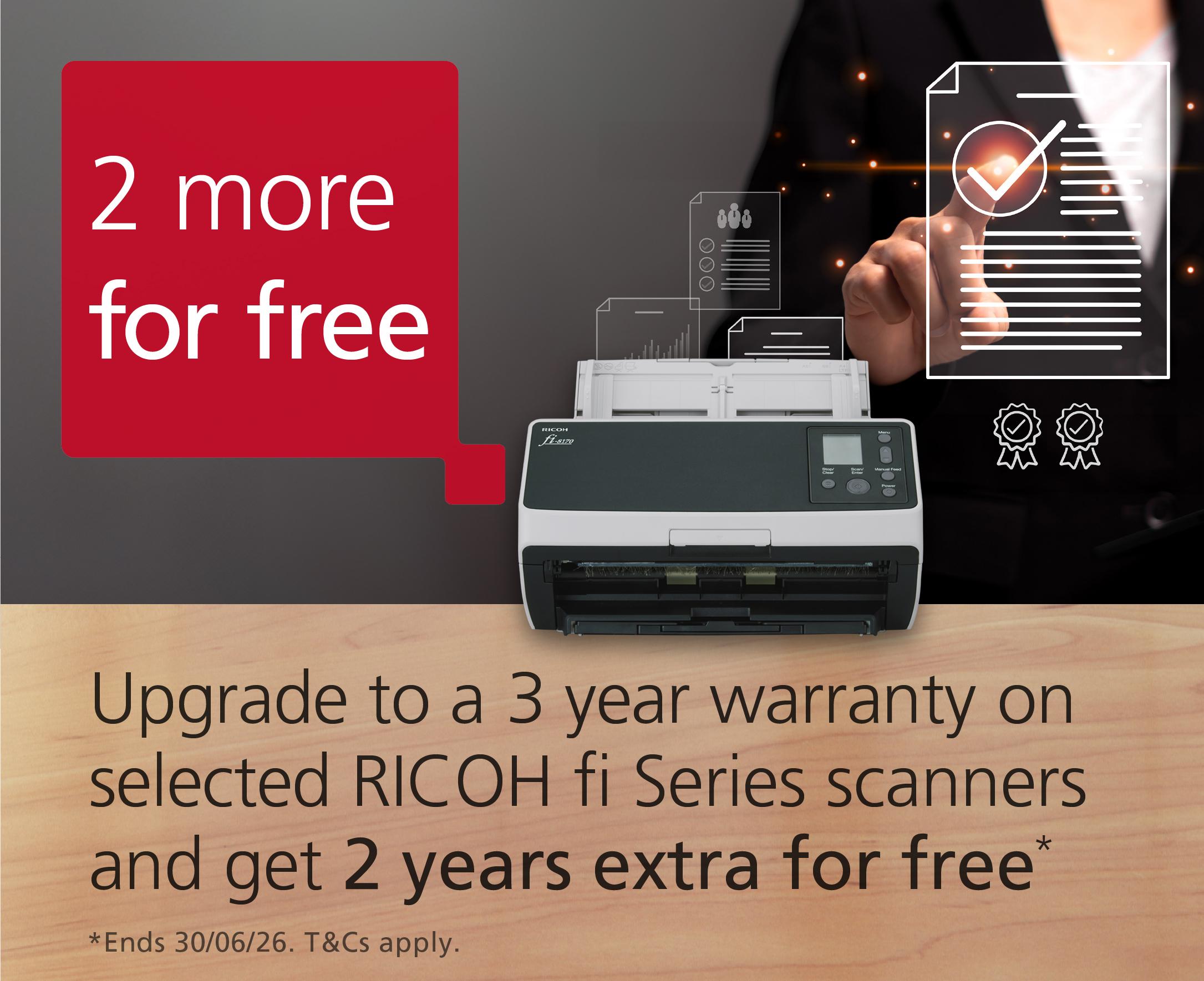 При закупуване на скенер RICOH от моделите fi-8040, fi-8150, fi-8170, fi-8250 или fi-8270 заедно с 3-годишен сервизен пакет/U3-EXTW-WKG/ – RICOH подаряват още 2 години безплатна поддръжка.
