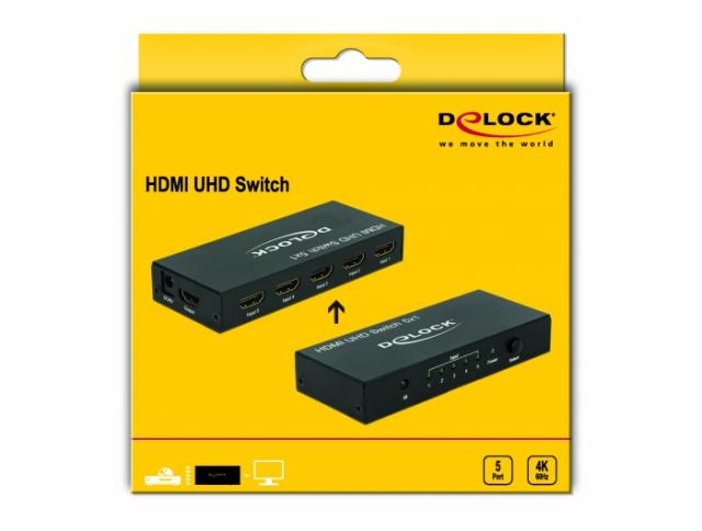 HDMI превключвател Delock за до пет HDMI устройства (HDMI монитор, телевизор, предавател...).