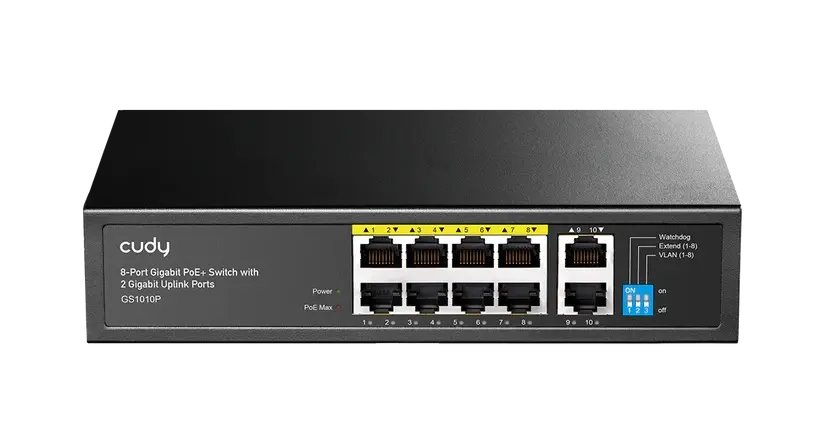 A compact and reliable 10‑port Gigabit PoE switch designed for small businesses, offices, and IP‑camera setups, the Cudy GS1010P V3.0 delivers stable performance with 8× PoE+ ports, a total PoE budget of 120 W, VLAN/Isolation mode, and robust metal housing for long‑term durability.