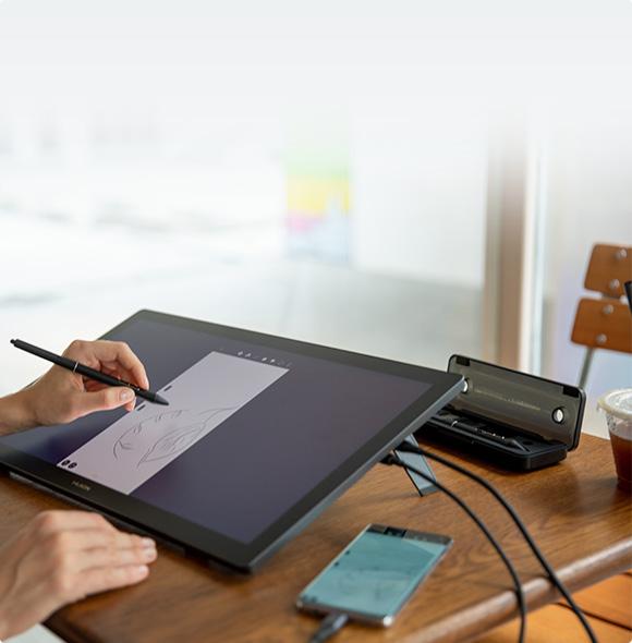 С леко тегло от само 2 кг, Kamvas Pro 19 разполага с преносим 18,4-инчов 4K дисплей. А иновативното платнено стъкло предлага освежаващо и приятно изживяване при гледане и рисуване.
